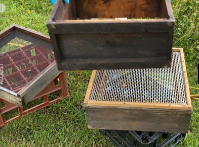 Using a hive carrier, Louise and Peter moved the hive 50 metres away from its original site and placed it next to the prepared equipment. In this case, our hive had two supers on it and using the carrier again, these were immediately returned to a floor on the original site. This gave the flying bees somewhere to return to. The purpose of moving the hive is to substantially reduce the number of flying bees and therefore the potential for getting stung!