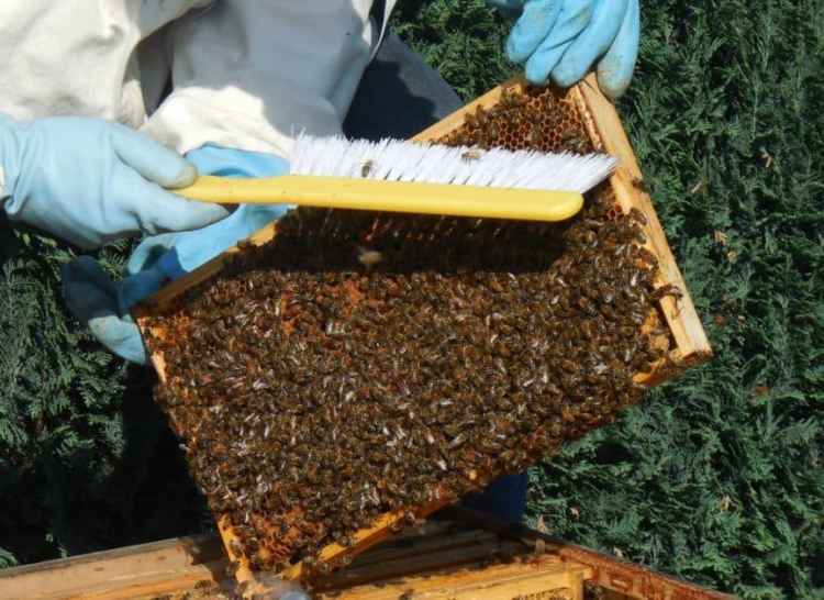 The bees from each frame are shaken or brushed off into the empty brood box.