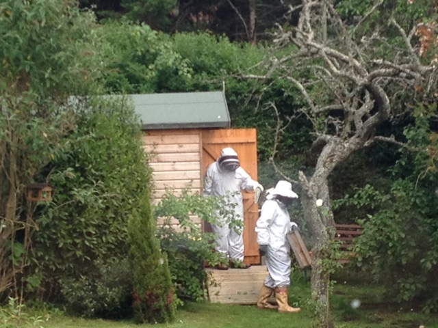 The little room was evacuated and the door firmly shut as we called for beesuits! It was decided to open the window to assist the bees exit. The vacuum cleaner was used. Time to retire for a cup of tea provided by Una, God bless her!