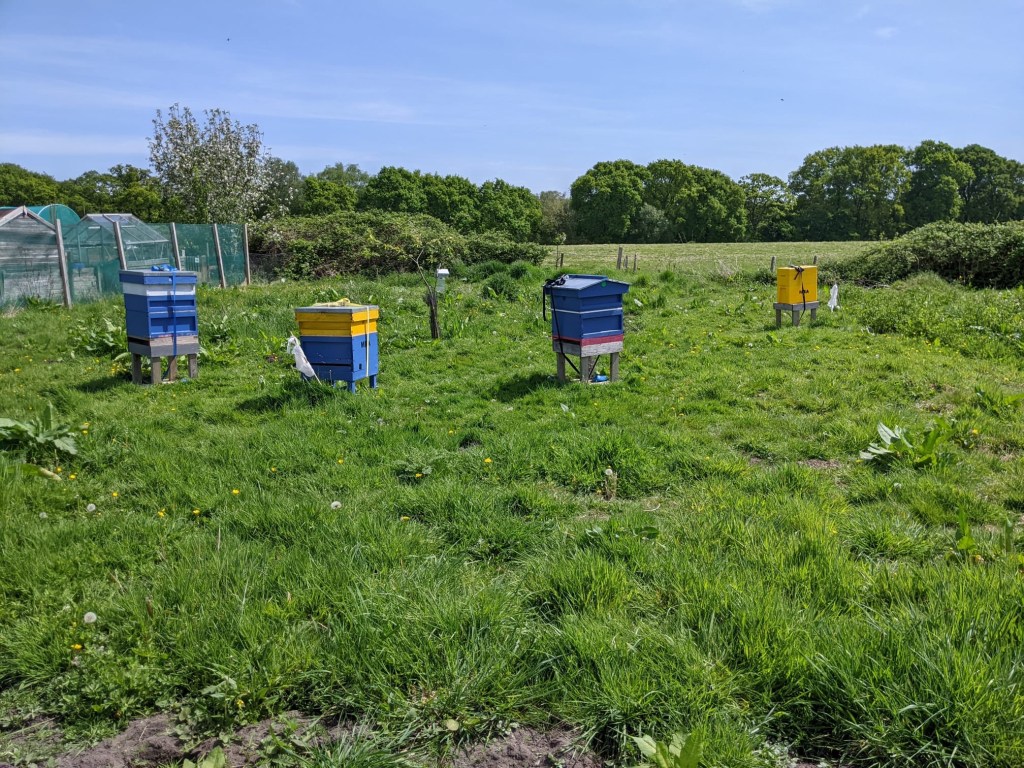 On 26th March, Stage One commenced by placing a clean brood box with clean frames, complete with foundation, on to the top of the existing brood box, matching the number of frames used by the bees and placing a dummy board each side. A feeder of 1:1 syrup was placed on the top of the crown board and the hive was left for a week.