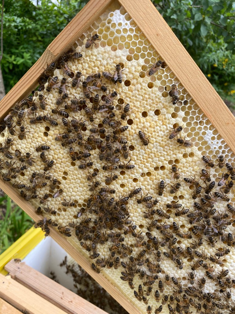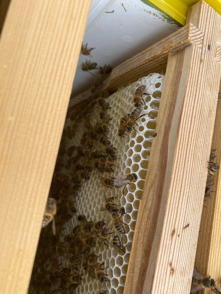 This week, 4th July, I had another look. I think in about a week the Nuc will be ready to transfer into my poly hive and into the main apiary; making my hive count five.