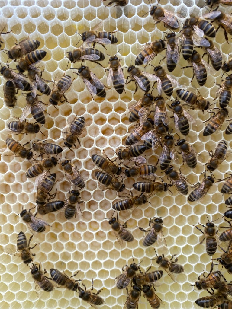 The bees had drawn at least three frames of beautiful white comb and I could see pearly white larvae at all stages and eggs in the cells. And there, sitting in the middle of the frame was the queen. No sign of disease and she was laying wall to wall.