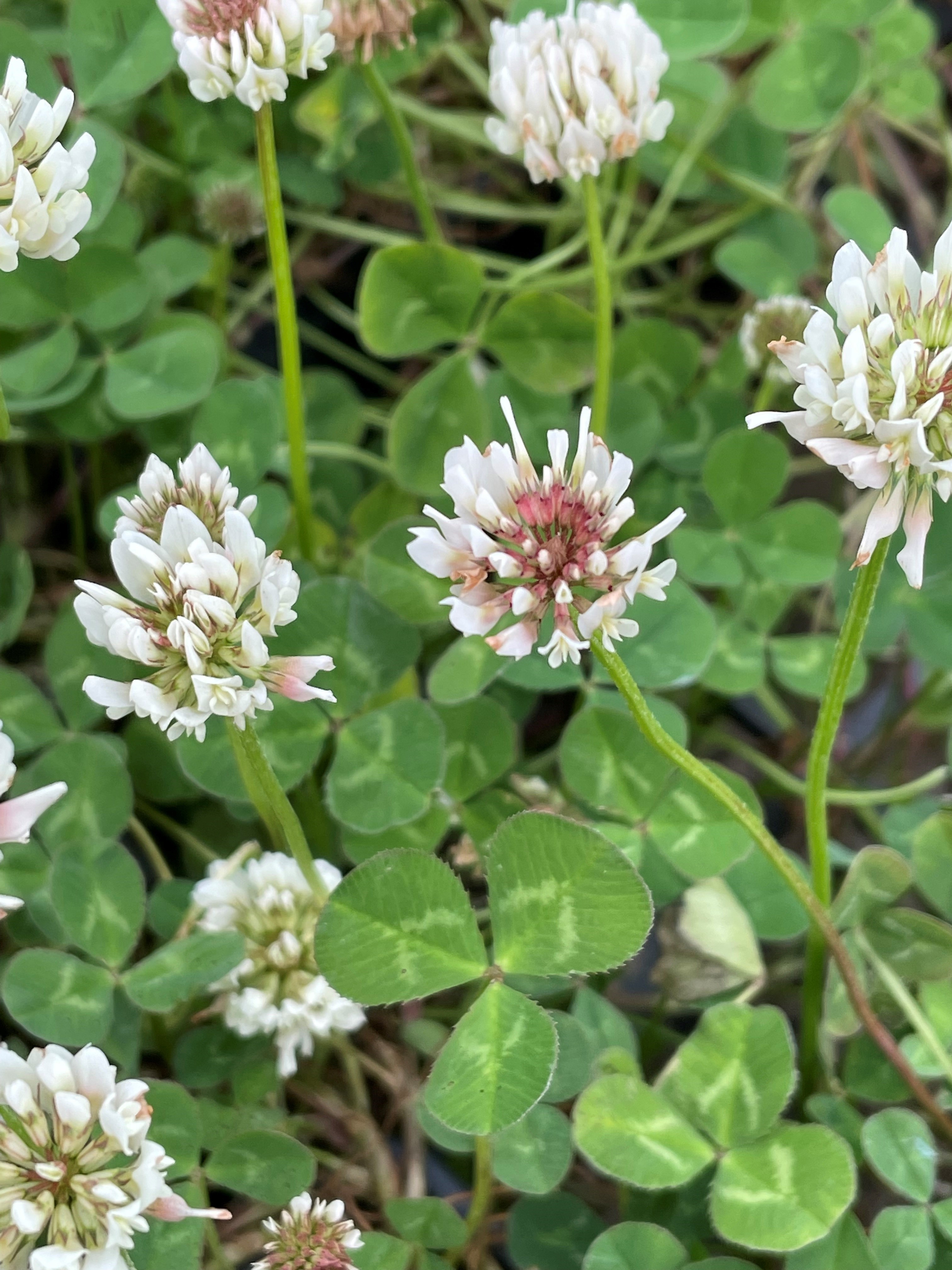 Clover (trifolium). Small-leaved white clover is a creeping perennial that roots at the nodes. Between May and October, on long stalks, it bears rounded heads of creamy white flowers, sometimes with a hint of pale pink that fade to brown. Leaves are trifoliate – or four leaved, if you’re lucky! Leaves have rounded tips and often bear a white mark. Valuable to wood mice, bumblebees and common blue butterflies well into autumn.