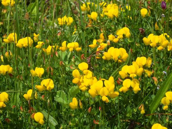 Birdsfoot trefoil (lotus corniculatus). Common bird’s-foot-trefoil has a variety of names that conjure up some interesting images: ‘Eggs and Bacon’, for instance! Its small, yellow, slipper-like flowers can be seen in all kinds of grassy places. It grows to 35cm and is Common throughout the UK between May and September.