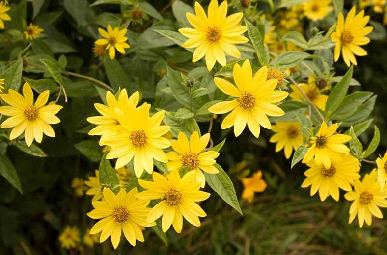 Heleniums thrive in most soil types, and prefer full sun. It is best to support them by staking around the clump in spring. They dislike heavy, wet soil, and won’t flower in shade. Avoid planting in a windy position as taller flower stems may blow over.