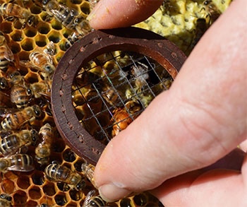 In order to mark a queen, you’ll need to keep her still for a moment. A queen trap or crown of thorns as it’s sometimes called, can be gently placed over the queen to trap her against the comb. The special marker pen can then be used to apply the paint to the queen’s thorax; that’s the middle bit!