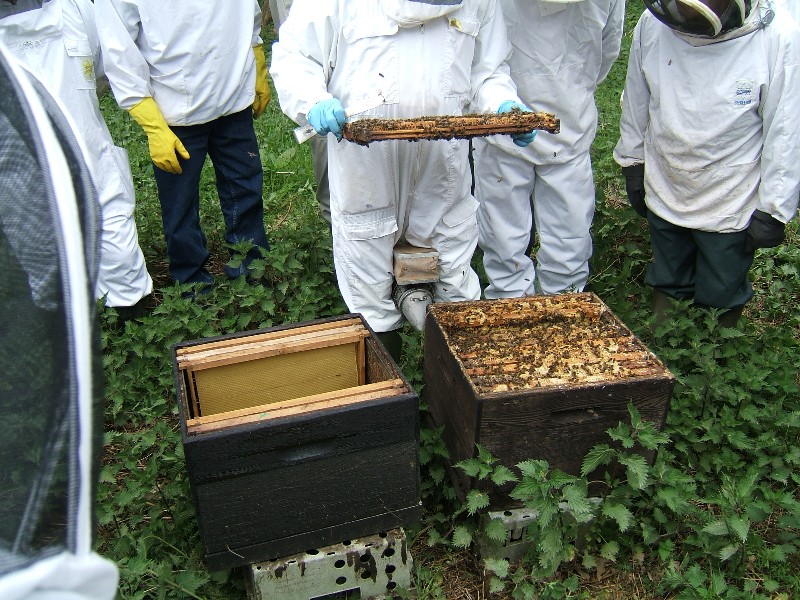 By now, one breeder queen was already laying on fourteen frames on double brood. My method was to add a queen excluder above the double brood boxes, having first removed a frame of pollen, a frame of honey/nectar, a frame of eggs and a frame of larvae and replacing them with foundation. I then added two supers and an adapted queen excluder with bee space and an entrance. I then added another brood box, placing in the centre the frames of pollen and larvae with nurse bees.