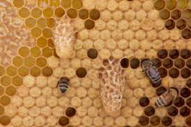 Emergency cells are developed from an egg already laid in a worker cell or very early-stage female larvae and are therefore found on the face of the comb within a patch of worker brood. There will usually be between one and three emergency cells which will have been raised from very young larvae (no more than two to three days old). The drawn cell often protrudes slightly at the top where it has been adapted from a horizontal worker cell into one which is vertical.