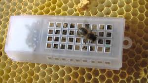 • Re-cage her in the queen cage with fresh fondant. Place this cage firmly between two frames in the receiving colony