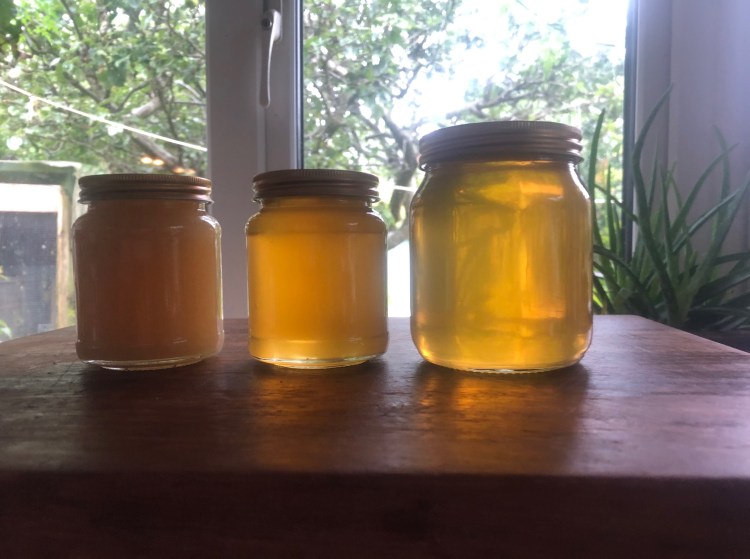 The middle jar has not been warmed in any way. The weather was warm. It went straight through 2 filters after spinning and was then settled for 24 hrs before being jarred. Settling allows the air bubbles added when pouring from the spinner to the tank with filters to rise to the surface. Depending on the type of honey this will granulate quite quickly – it is from the same spinning as jar on the left.