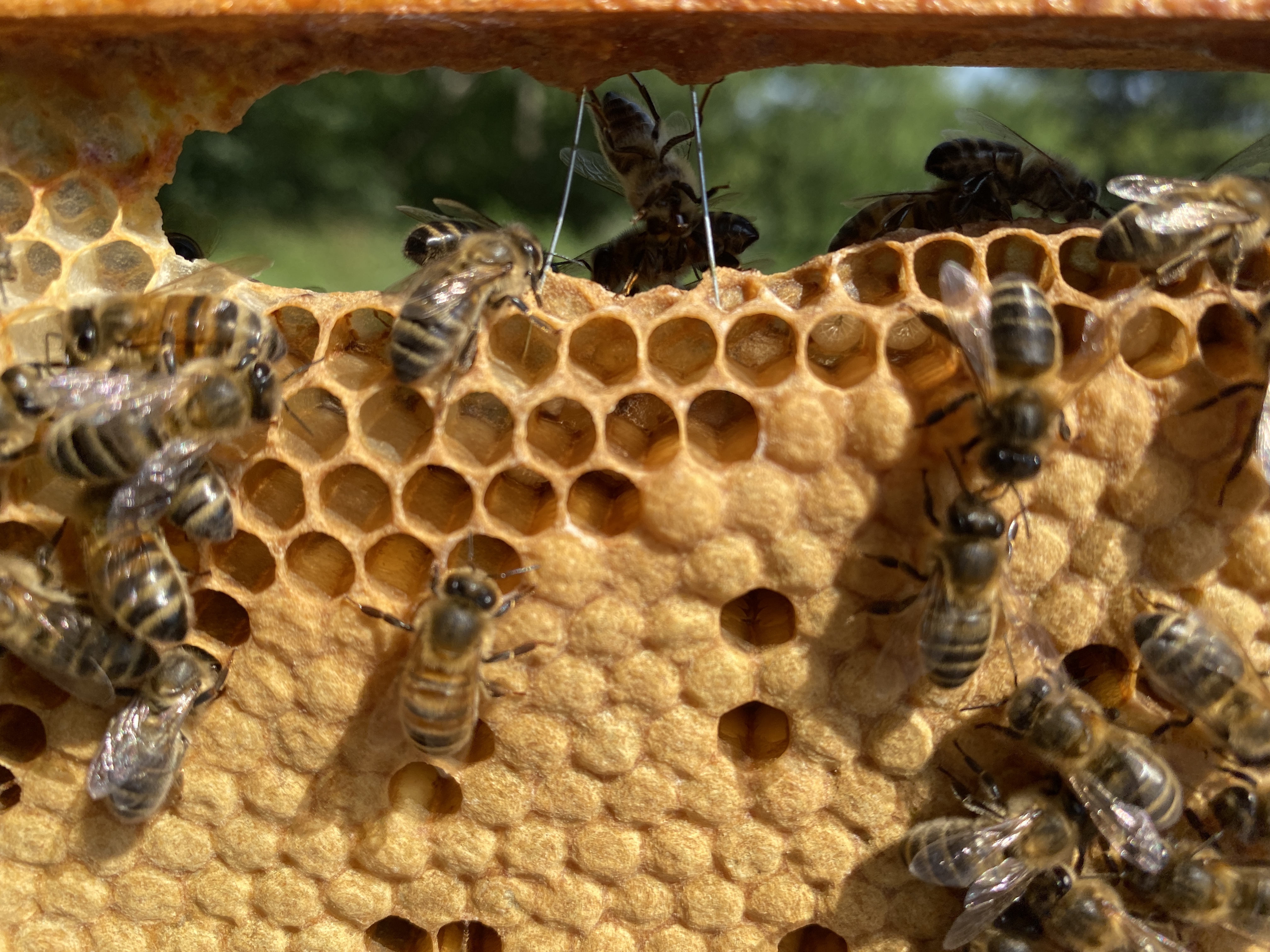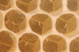 Healthy brood is pearly-white. The segments of the bodies should be clearly visible and each larvae lies at the bottom of the cell in a ‘C’ shape. Cells containing eggs should contain only a single egg, standing on its end if it has just been laid or lying flat at the bottom of the cell if it’s two or three days old.
